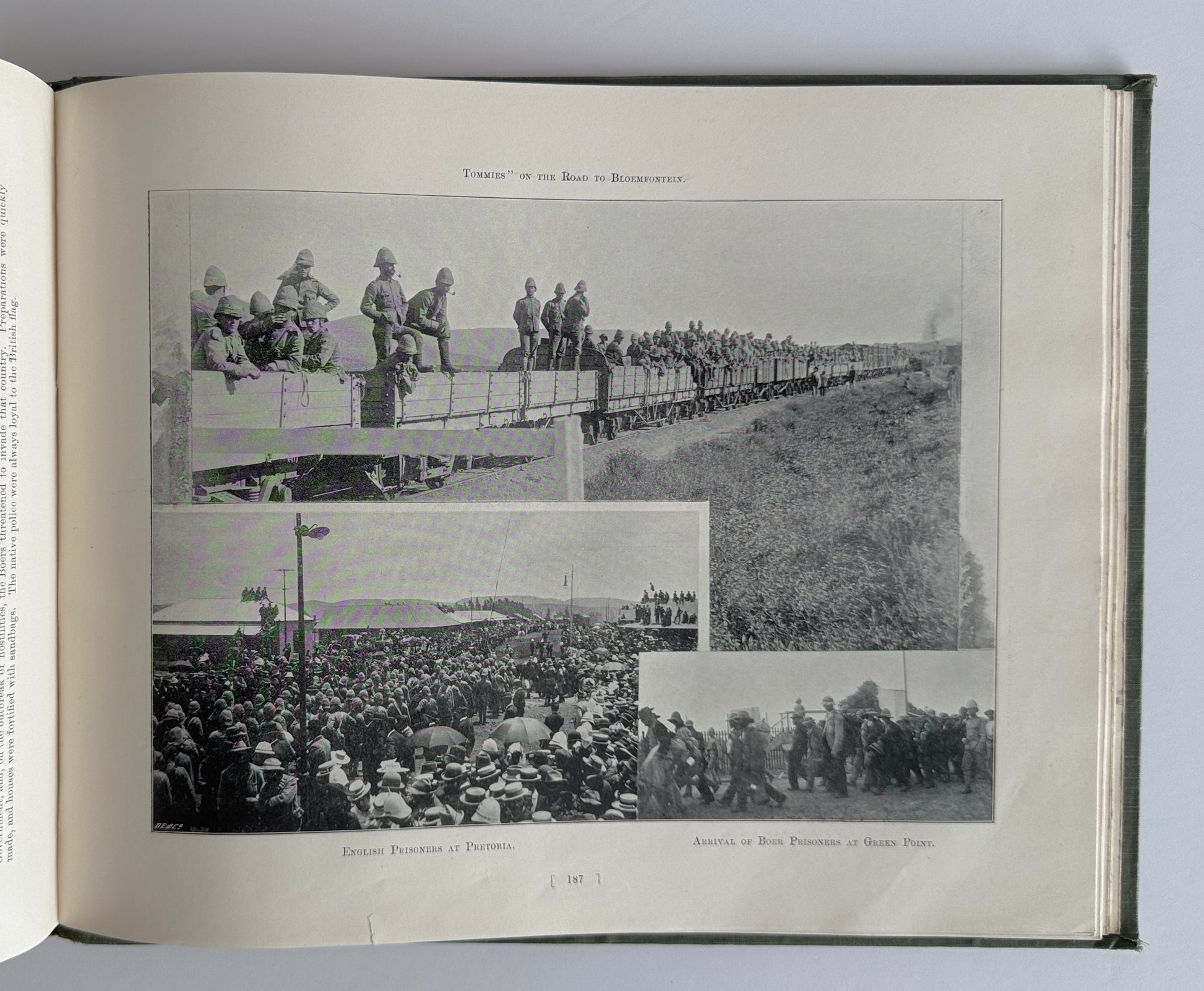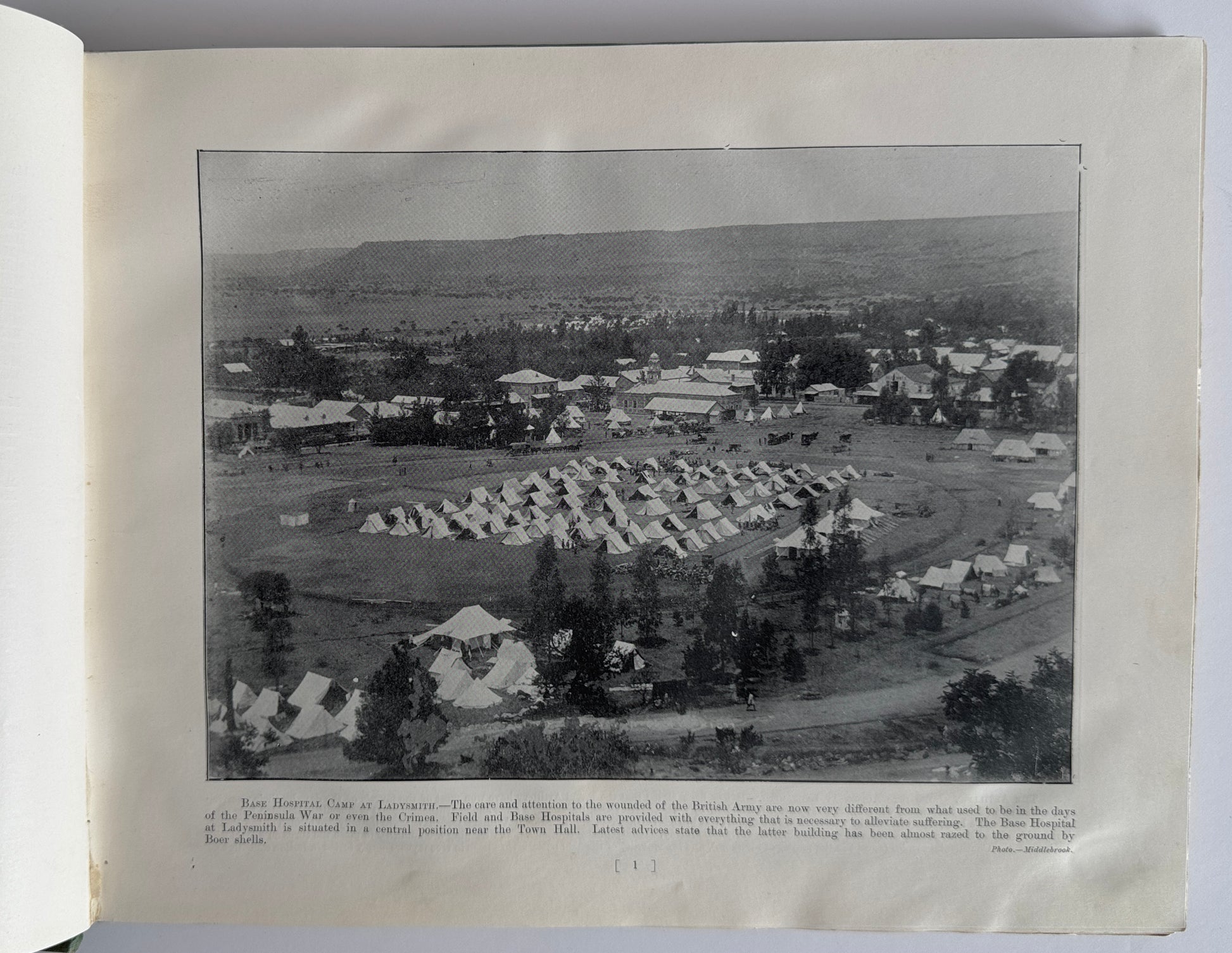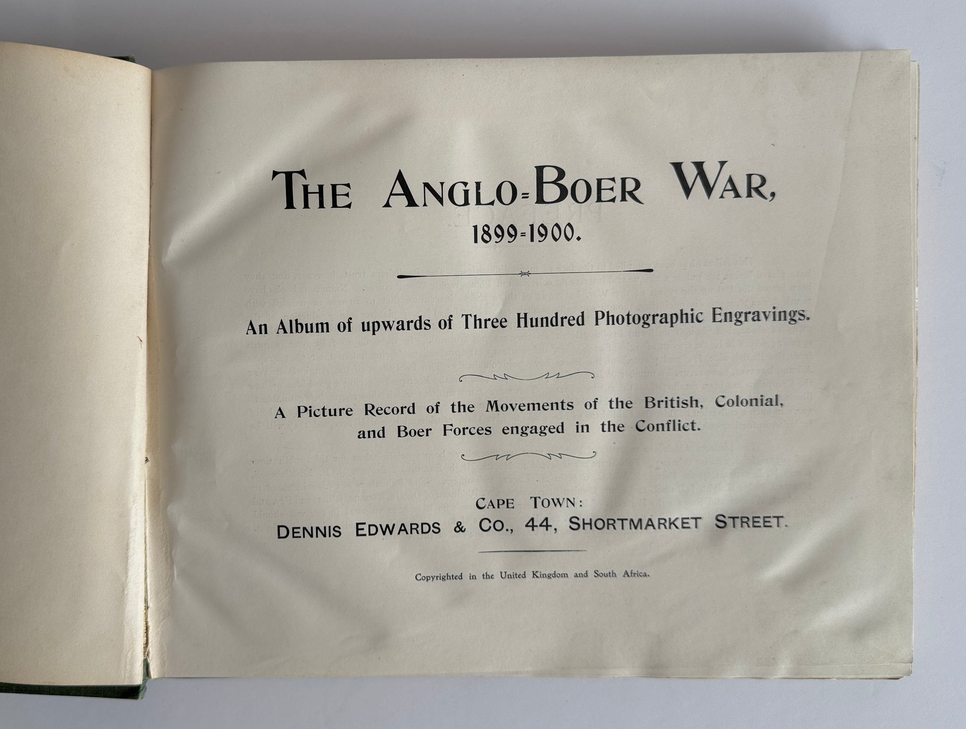An album of upwards of 300 photographic engravings. A superb photographic account of the movements of the British, Colonial and Boer Forces engaged in the conflict with a summary at the end of the book. Bound in the publisher's original green cloth covers on decorative boards with an attacking cavalryman. The book is in a large oblong format. There are some markings on the back cover and some shelfwear to the extremities. The book is tightly bound.