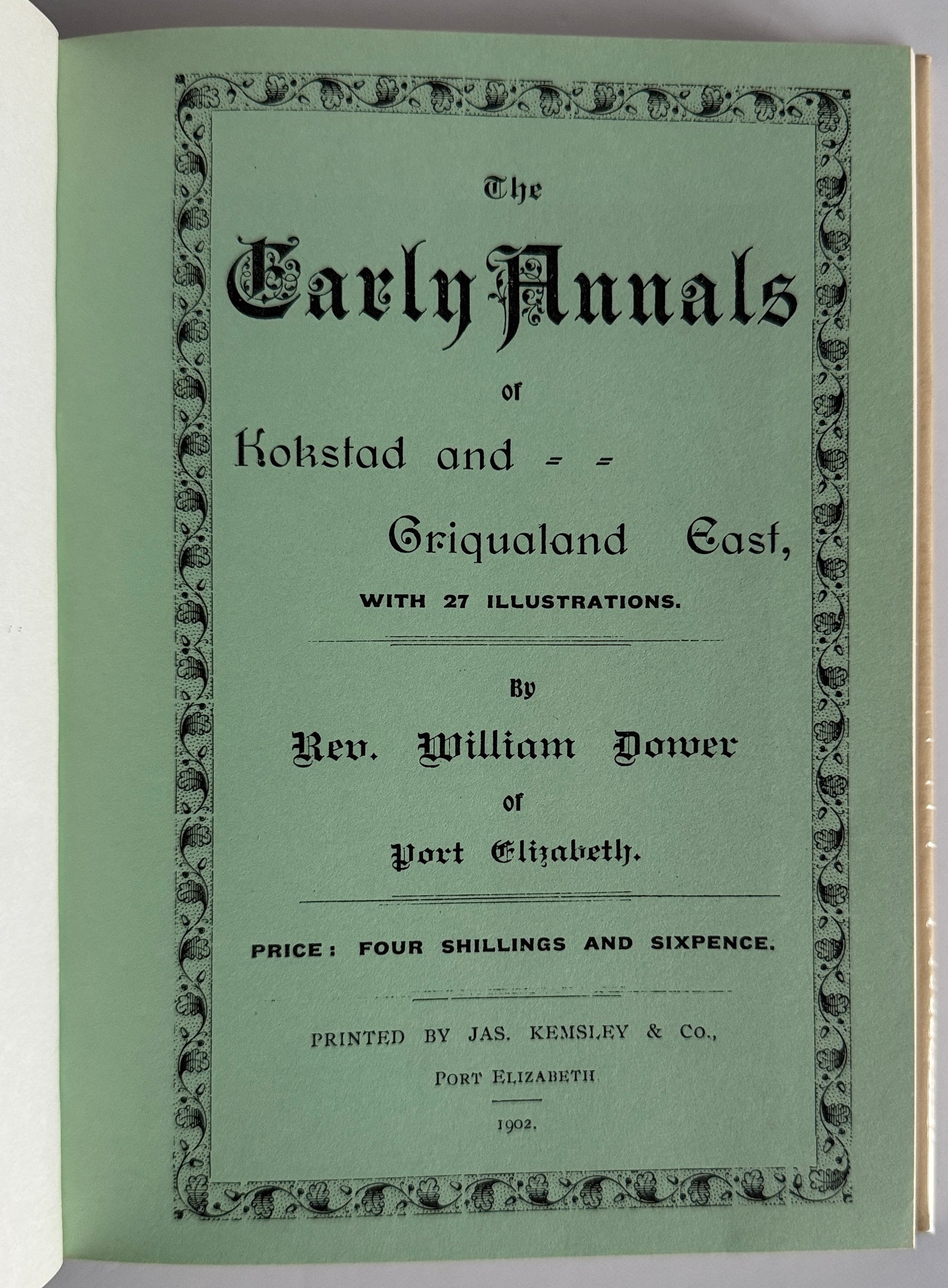 Facsimile reprint, hardcover with dust jacket, in fine condition. Reprint of the incredibly rare 1902 edition with additional material. This is an important book (both 1902 original and 1978 reprint) as it traces the history of the Griqua Nation from their origins around Douglas in the Northern Cape, via Philippolis in the Southern Free State, to their forced move and subsequent settlement in Kokstad and Matatiele, in East Griqualand. Externally, original cream dustjacket in a removable protective sleeve, covering original dark green hardboard covers with gilt titling to the spine. Internally, the pages are clean, bright and unmarked. Photos provided reflect the condition in addition to the above description. Overall condition is fine