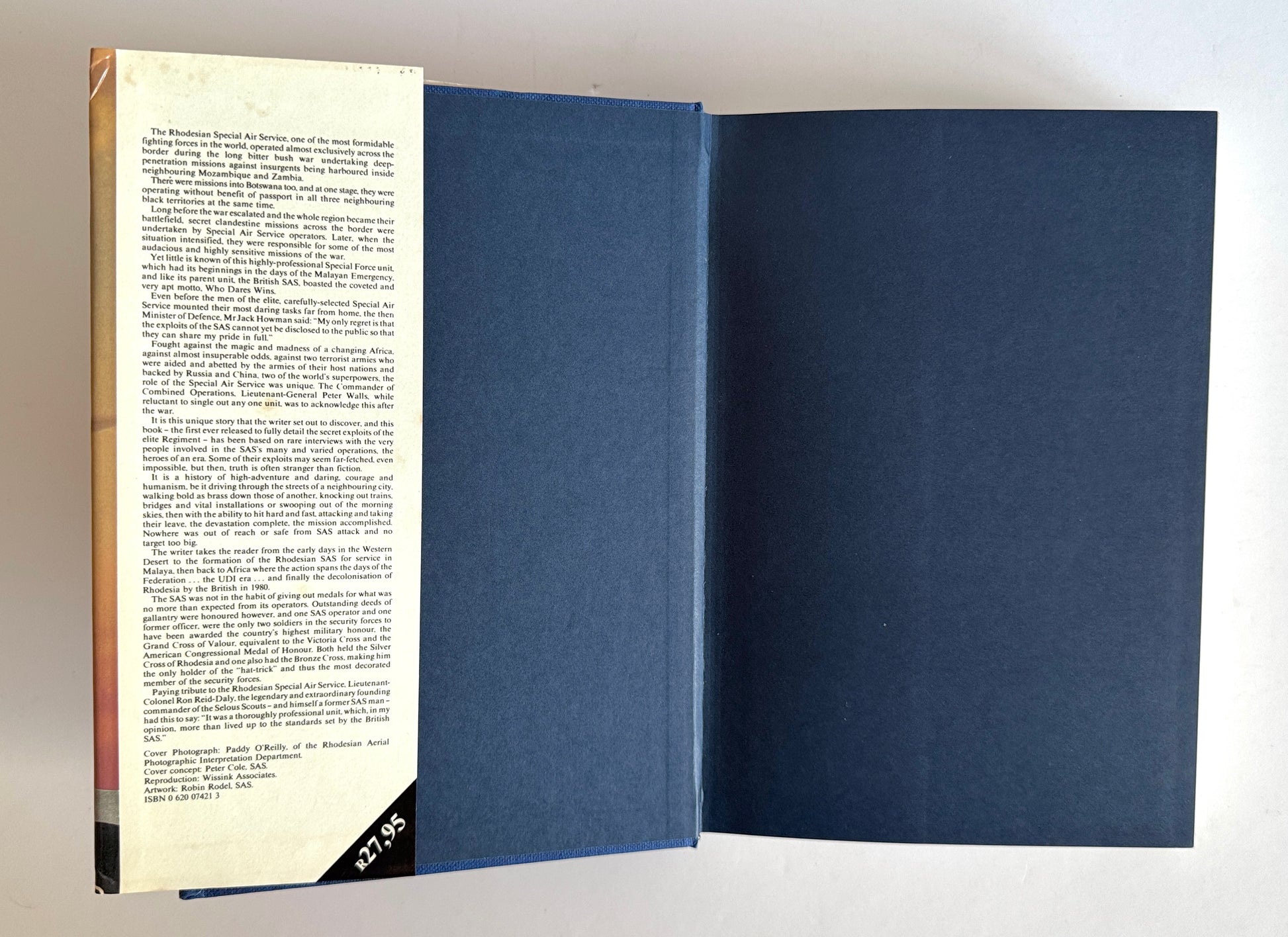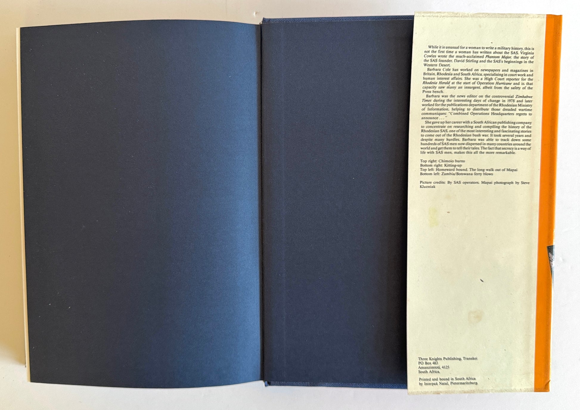 Published in 1985, this popular book is a comprehensive military history of Rhodesia's most prestigious special forces unit. The book provides a detailed narrative based on rare first-hand interviews with SAS operators. This hardcover copy is a third edition, signed by the author, "With best wishes , Barbara Cole". Original dust jacket over cloth covered boards and internally pages are clean and binding is tight.