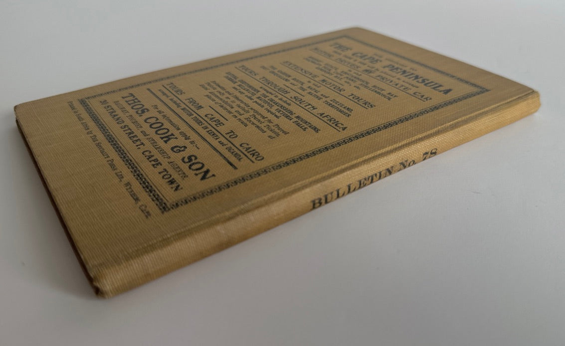 A very good copy of this vintage travel book of the Cape Peninsula and surrounding districts. Produced by the Cape Peninsula Publicity Association and the South African Railways and Harbours and provides details of motoring trips around the area and includes period photos and two linen backed foldout maps. There are period advertisements at the front and rear of the book. This is a very good tight copy with ink stamps of the Trade Commissioner to front board & first page.